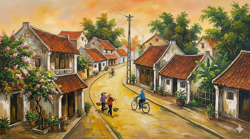 Dieses Wandgemälde zeigt das Dorf Phu Ly, wo unsere Familie geboren und aufgewachsen ist. Von unserer Heimat zu Ihrem Tisch bringen wir authentische vietnamesische Aromen.